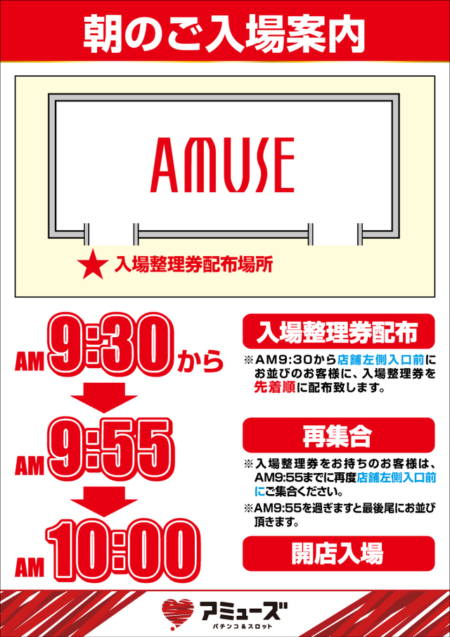 ニュース 朝一整理券のご案内 朝一番から来て下さるお客様へ 整理券配布・終了時間のご案内です。 夏には扇風機、冬にはストーブを用意し より快適にお待ちいただけるよう ご用意しております。 ニュース一覧 AMUSEグループ 一番の老舗です♪お客様に愛されて27年目突入♥ X始めました♪ LINE@お友達募集中 AMUSE PRESENTS ブラマヨ吉田のガケっぱち! アミューズチャンネル ユーチューブにて 車内放置は絶対ダメ!! 朝一整理券のご案内 アクセスマップです! リカバリーサポートネットワーク